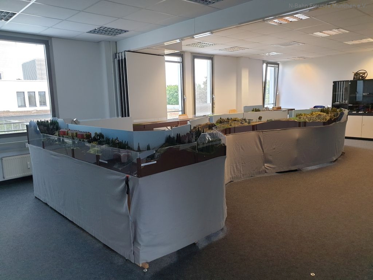 Die Firma Lokomotion veranstaltet diesen „Tag der offenen Tür“ in München normalerweise zwei Mal im Jahr zur Anwerbung neuer Mitarbeiter. Auf Einladung von Lokomotion präsentierten die N-Bahn Freunde dann zum fünften Mal seit 2018 einen Teil ihrer Modulanlage mit knapp 20 Modulen und zeigten dabei verschiedene sich im Einsatz befindlichen Loks als Modelle von verschiedenen Herstellen in der Spur N (im Maßstab 1:160). Trotz der kleinen Aufstellfläche war es wieder möglich, schöne Züge bekannter Speditionen von Lokomotion in einer Länge von bis zu 2,50 Metern fahren zu lassen.
