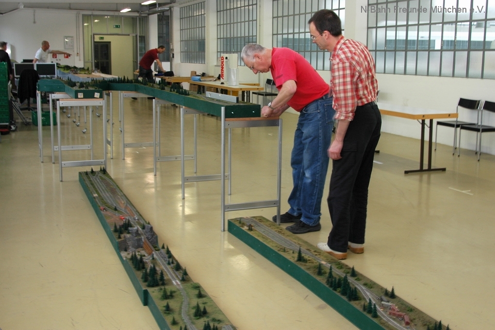 Wir, die N-Bahn Freunde München, hatten wieder einmal Lust, unsere zahlreichen Module auszupacken, in Betrieb zu nehmen und darauf Fahrbetrieb mit langen Zügen zu machen. Unsere Module mit detailliert gestaltetene Szenen aus dem Alltag sind von früheren Ausstellungen und aus der Modulgalerie schon relativ gut bekannt. Es macht aber immer wieder Spass, sie zu neuen Anlagenlayouts zu kombinieren. Und immer wieder gibt es neue, neu gestaltetete oder weiterentwickelte Module zu besichtigen, die zum Entdecken einladen.